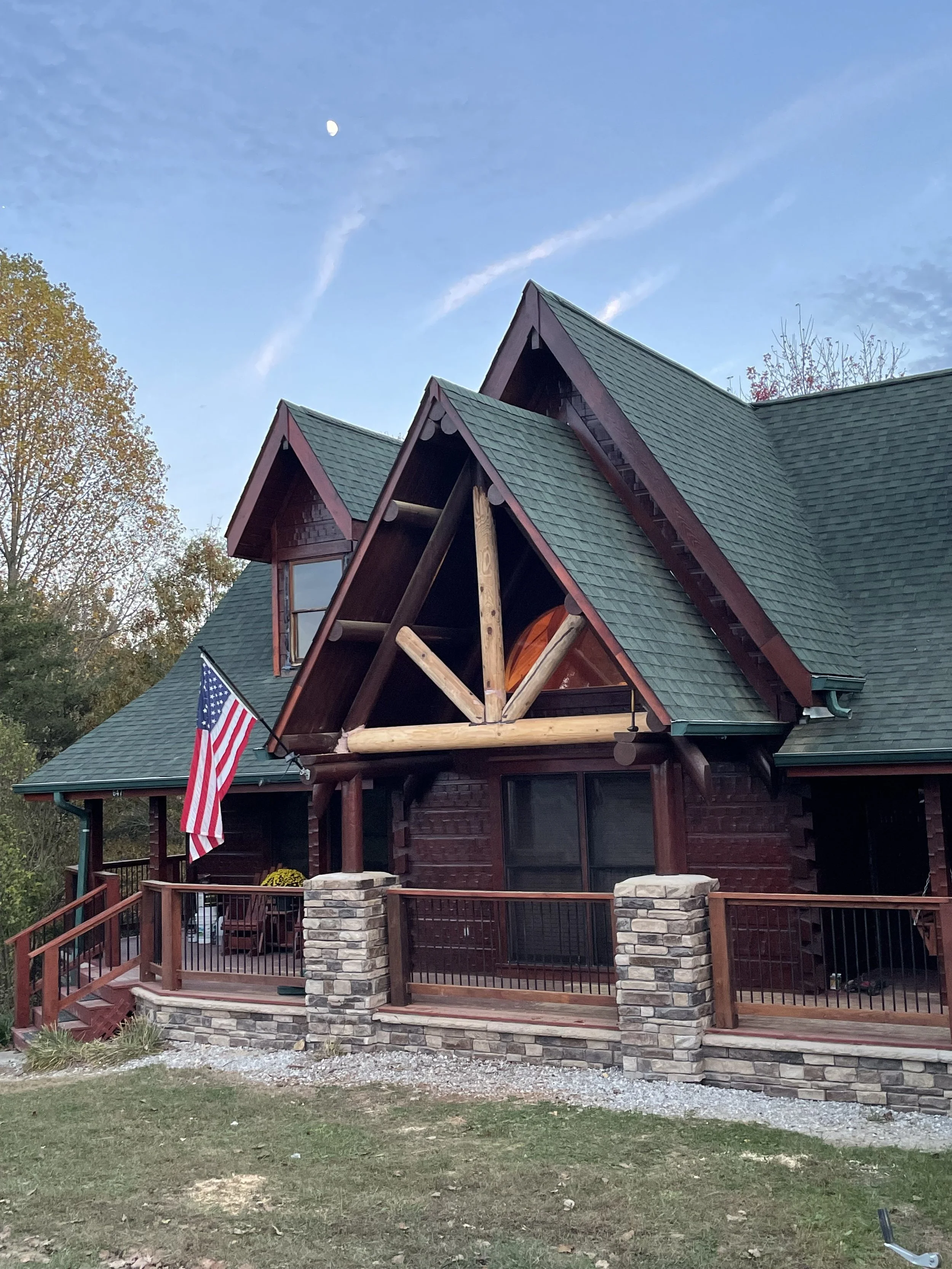 This Restoration project was Awesome! Custom Grilling/Sunroom-All Stone work including columns were completed. Along with 4500lbs of Crushed Glass media was used to completely strip the old paint off and then I utilized Perma Chink to stain his home to a Beautiful Bronze.